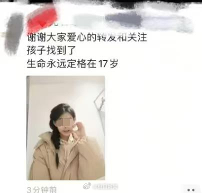极目新闻记者注意到,此前已有多名网友在评论区留言称,人已经找到,去世了,大家不要再转发寻人启事了。有朋友圈截图显示,谢谢大家的爱心转发和关注,孩子找到了,生命永远定格在17岁。